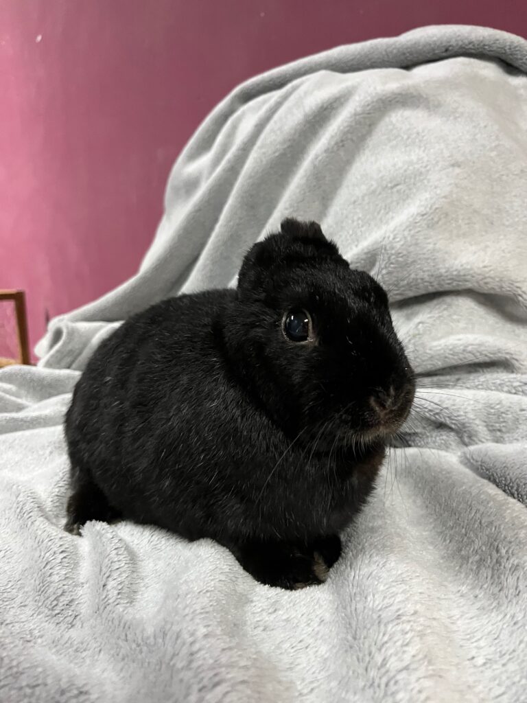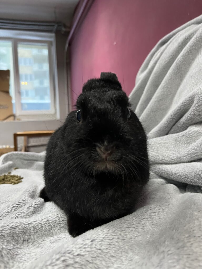 Uszanka to drobna, czarna króliczka, która doskonale pokazuje, że brak uszu w niczym nie definiuje jej życia. Świetnie sobie radzi, jest samodzielna, ciekawa świata i absolutnie nic jej nie zatrzymuje.
